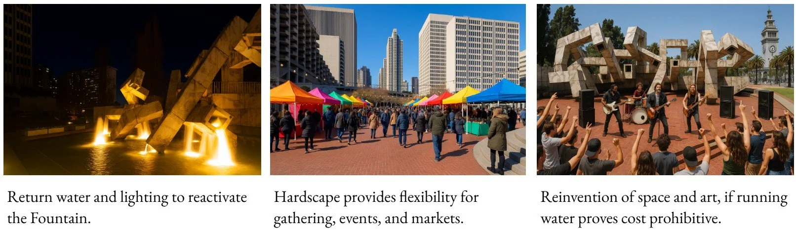Fiscal Responsibility via Adaptive Reuse: In economically uncertain times, adaptively reusing Embarcadero Plaza and Vaillancourt Fountain rightsizes the project, better spending $15-30+ million in public and private funds. Use funds for maintaining public spaces and art instead of one-time upgrades.