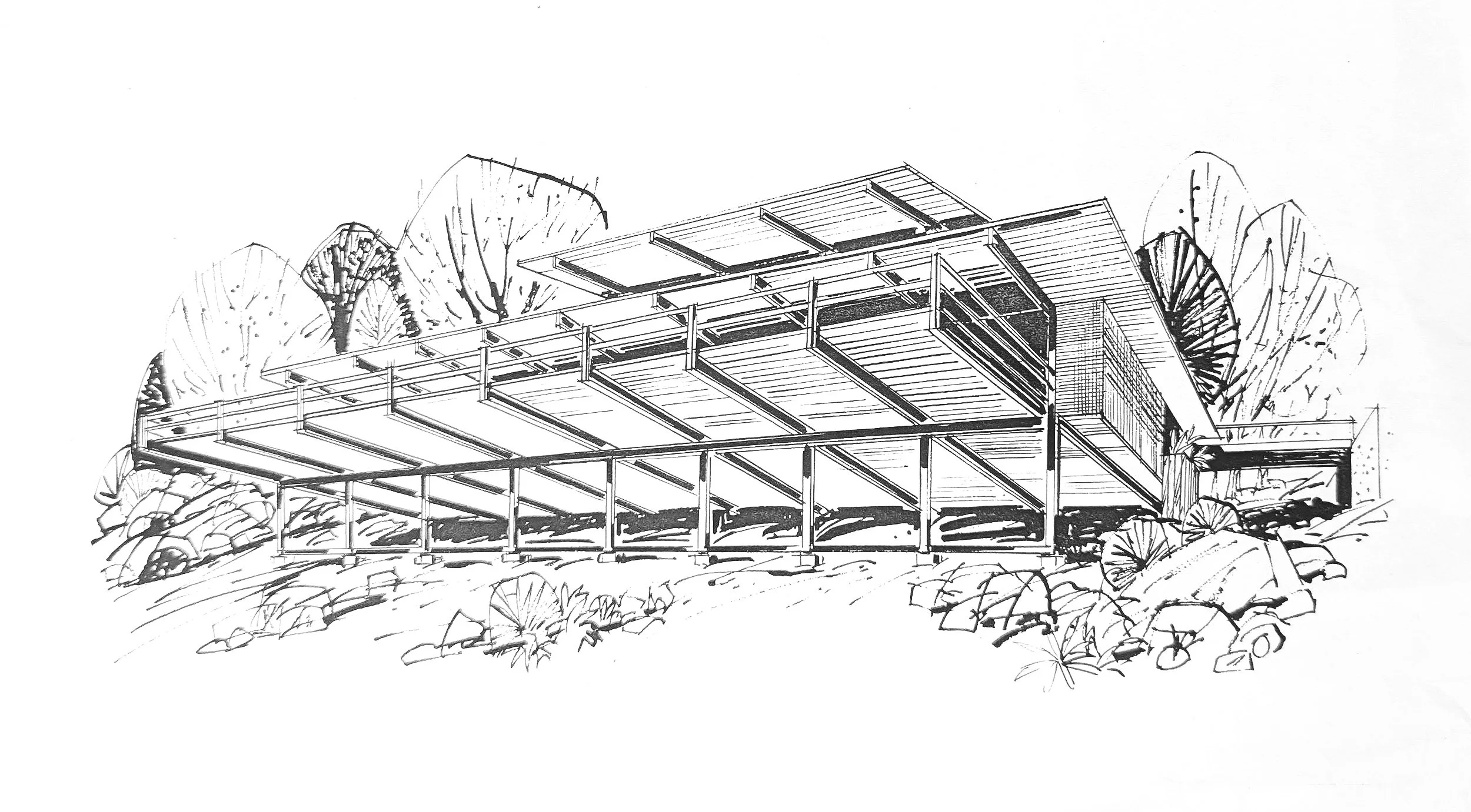 Built for a Bethlehem Steel executive as a personal residence. The glazing in some areas (clerestory) is frameless, suggesting a borderless indoor/outdoor environment.
