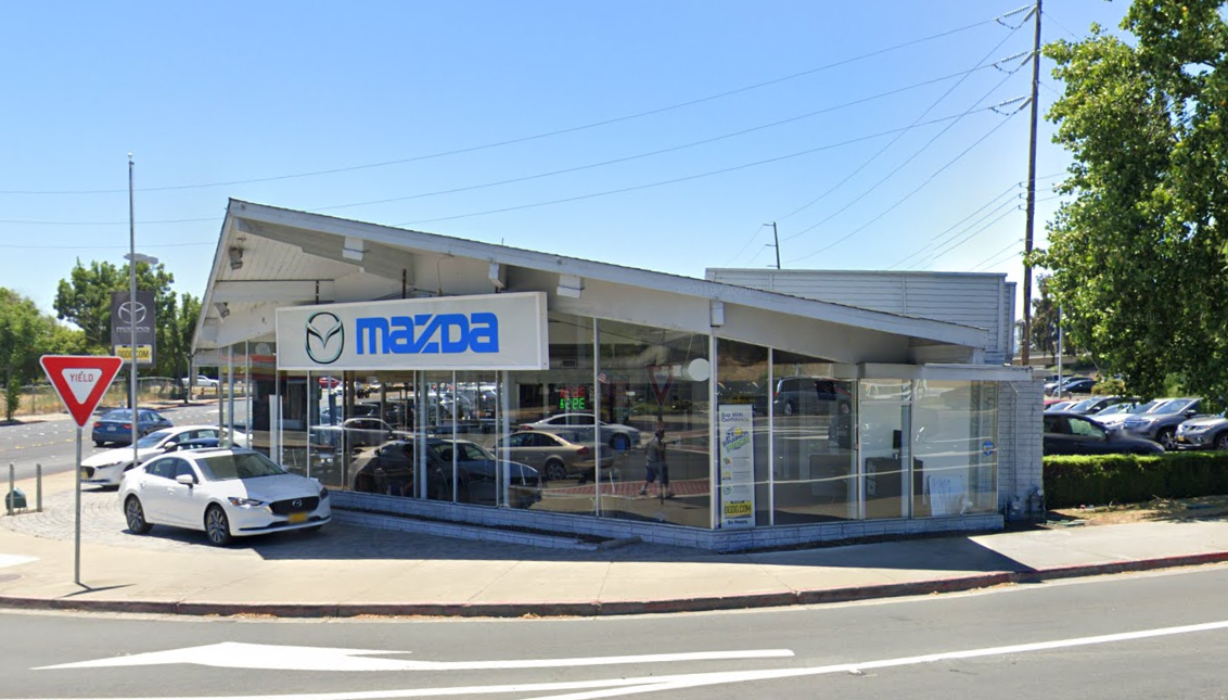 Here we have an inverted example of the showroom in Hayward (further down the list). Instead of the wings of the building going up like a butterfly, these are going down, as if to mimic the wings of a fighter jet. This was built around the same time, in the early 1960s. It employs similar techniques, just executed slightly differently and with different materials. The structure of the building still pierces through the facade, but this time it’s sturdy-looking wood, giving it a post-and-beam look reminiscent of Eichler homes of the time. Directly past the facade and into the structure you can see the steel pilotis (hello Le Corbusier) holding up the roof, allowing for the great expanses of glass to perfectly showcase the best the automotive design world at the time had to offer. Any car would look good in this building.
